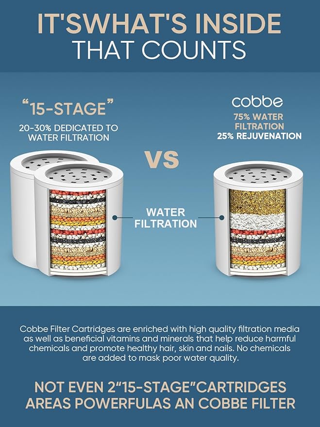 - 75% WATER FILTRATION: Cobbe filters are 75% calcium sulfite pellets and KDF-55 (not cheap beads), which effectively filter heavy metals and chlorine from water and protect your skin and hair.