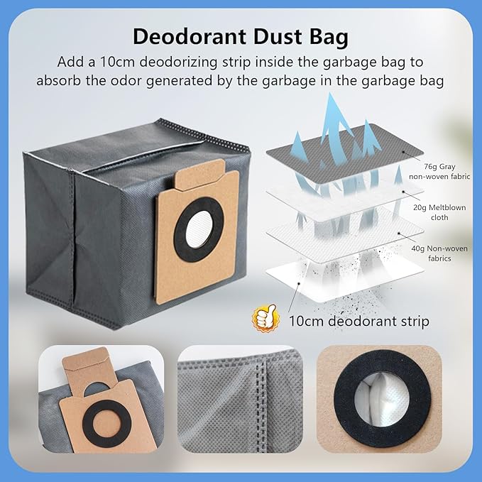 - [Advanced Filtration & Odor Control] The X10 Pro Omni dust bags contain activated carbon to effectively absorb odors. The multi-layer HEPA filter captures 99.97% of 0.3-micron particles, preventing secondary pollution and maintaining healthier indoor air