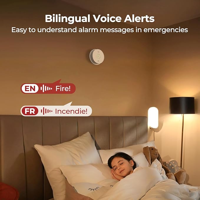 - BILINGUAL VOICE ALERTS: Clear English/French vocal warnings (85dB) instantly identify fire or CO threats with danger levels, reducing response time by 40% in multilingual households.