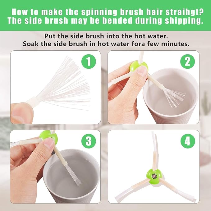 - You Can Get: 2 x Multi-Surface Rubber Brushes, 8 x Side Brushes, 8 x HEPA Filters, 1 x Clean Brush, and 1 x Screwdriver. If the side brushes bent due to shipping, recover them by simply soaking them in warm water for a while
