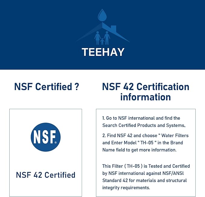 - This Filter (TH-05) is Tested and Certified by NSF international against NSF/ANSI Standard 42 for materials and structural integrity requirements.