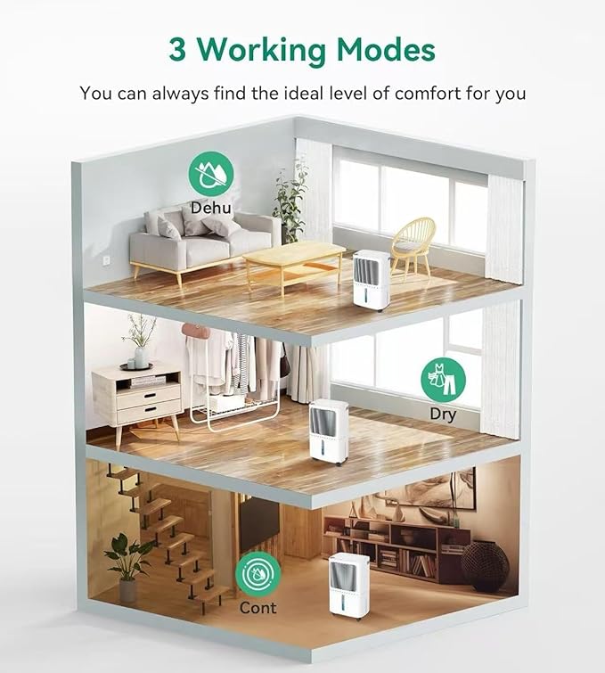 - Smart Mode Design Dehumidifier: The basement dehumidifier offers three freely switchable modes (DEHU, DRY, and CONT), customizable to your specific needs. The DEHU mode is great for controlling humidity in living rooms, the DRY mode quickly dries clothes, and the CONT mode is suitable for humid areas.