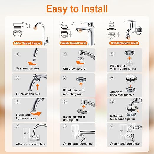 - 【Upgraded Universal Adapter & Easy to Install】The water filter for sink faucet comes with a universal adapter, four M22/M24 male/female thread adapters, and two M20 female fine/coarse thread adapters, fitting most common faucets. Comes with a wrench for quick, tool-free installation. No compatibility or installation worries.