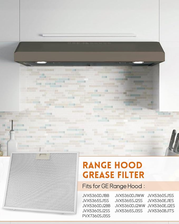 - Multiple Models Compatible: Our range hood grease filter fits for GE range hood JVX5360DJ1BB, JVX5360DJ1WW, JVX5360SJ1SS, JVX5365SJ1SS, JVX5365SJ2SS, JVX5360EJ1ES, JVX5360DJ2BB, JVX5360DJ2WW, JVX5360EJ2ES, JVX5360SJ2SS, JVX5365SJ3SS, JVX5360BJ1TS, PVX7360SJ3SS, replace WB02X27203