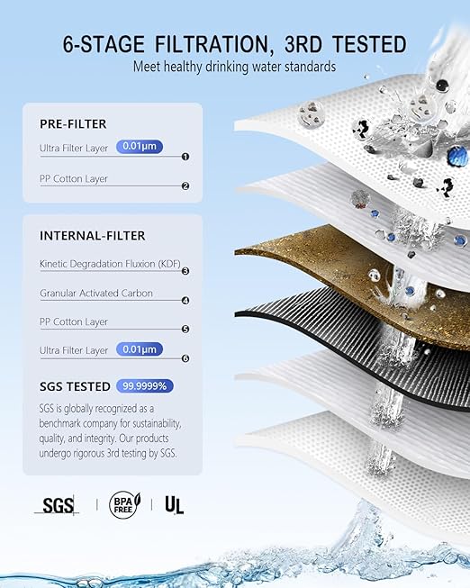 - Included Components electric water filter : Purification Method Advanced 6-Stage Filtration System, Ultrafiltration, PP, KDF and Activated Carbon Advanced 6-Stage Filtration System, Ultrafiltration, PP, KDF and Activated Carbon See more