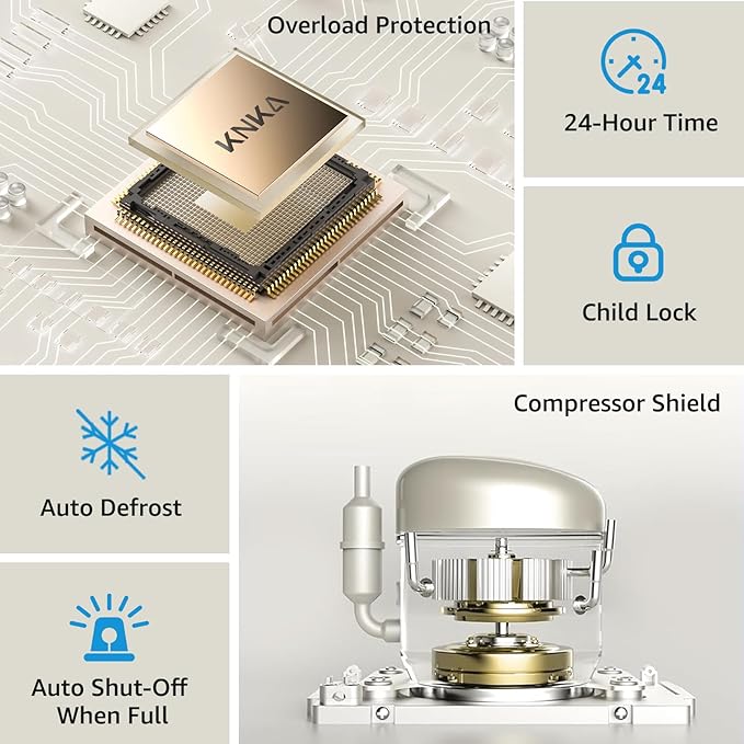 - Smart Safety - The unit features multiple automated safety functions, including overload protection, power outage memory, auto shutoff when the tank is full, and high-precision sensors for automatic defrosting. It ensures stable and efficient operation in any environment. Additionally, the built-in child lock prevents accidental changes, making it especially suitable for households with children and pets
