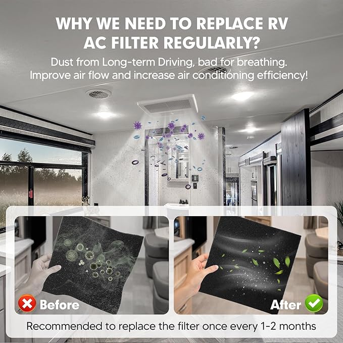 - 【Periodic Replacement】For optimal performance, we discourage cleaning and reusing old RV air conditioner filters. It is advisable to replace the filter with a fresh one every 1-2 months. Please note that the aforementioned time guidelines are for reference only and can be adjusted based on the frequency of air conditioning usage