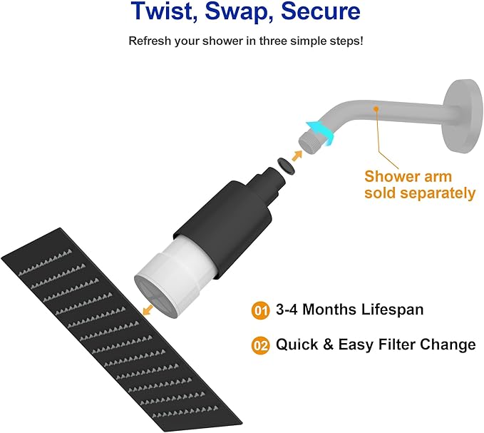 - Complete Package with Filter Cartridge: Includes everything you need: shower head, filter capsule, pre-installed filter, replacement parts, and user guide. One filter lasts 3–4 months depending on water quality.