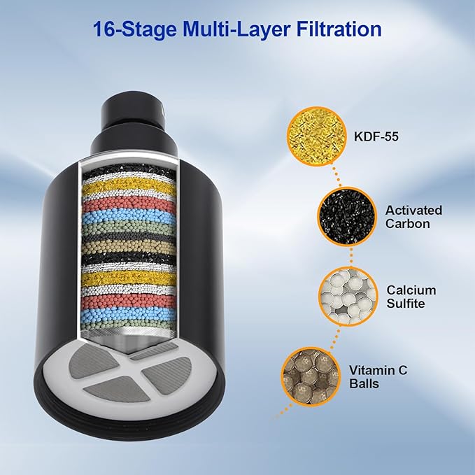- 16-Stage Powerful Filtration System: Equipped with a multi-layer filter using KDF-55, Activated Carbon, Calcium Sulfite, and Vitamin C Balls, effectively removes chlorine, heavy metals, and odors for cleaner water.