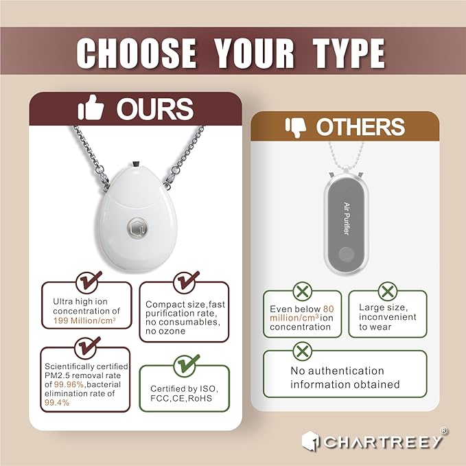 - ✨【Efficient Purification and Authoritative Certification】: Chartreey Personal Air Purifier Necklace leverages cutting-edge technology to release over 199 million negative ions per cubic centimeter. With a PM2.5 removal rate of 99.96% and bacterial clearance of 99.4%, it creates a 3D dynamic health shield. Backed by ISO, FCC, CE, and RoHS certifications, this device ensures safety without producing ozone, noise, static, or secondary pollution.