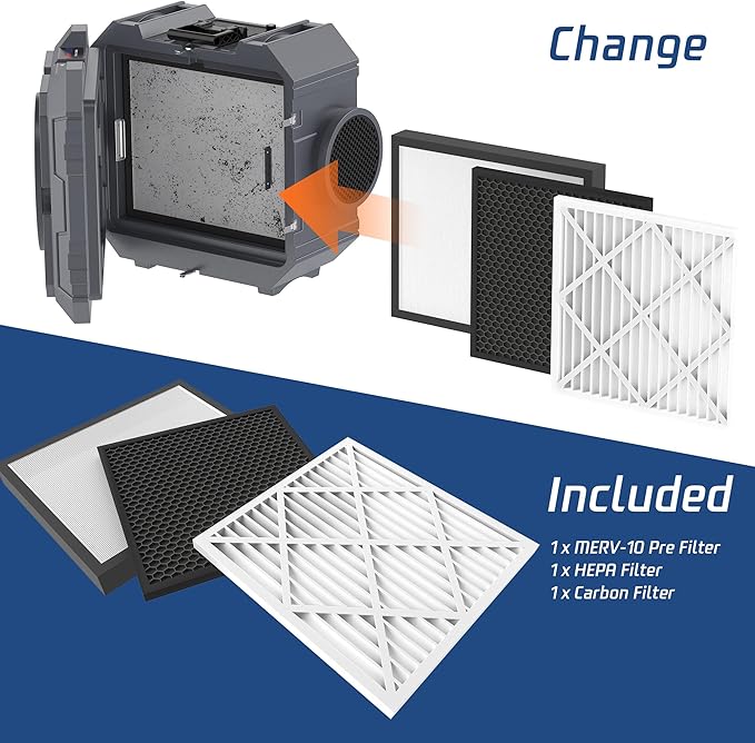 - 【Industrial-Grade Durability】This industrial air purifier features an ultra-rugged exterior, suitable for construction sites, sewage restoration, water damage restoration and fire damage repair. It also comes with a user-friendly control panel, knob-style airflow adjustment, timer reset function, and hepa filter replacement reminders.