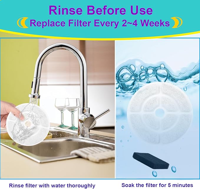 - š¶ ćCleaning and ReplacementćPlease soak the pet water fountain filter in water for 5 minutes and rinse it thoroughly under running water before use. According to your pet's drinking frequency and the number of pets using the dog fountain, please replace the cat fountain filter every 2 weeks.