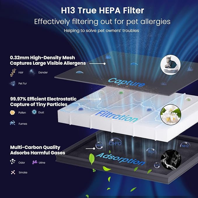 - 【H13 HEPA Filter Effectively for Pet Owner's Troubles】 Our air purifiers for home pets feature an H13 HEPA high-efficiency filter with 99.97% filtration efficiency which quickly captures ultra-fine particles of 0.1-0.3 μm in size and effectively breaks down pet hair, pollen, litter box smell, cigarette smoke, and kitchen fume within minutes. Our air purifiers for home are perfect for children and pet households and are especially friendly to people in fire zones and “air quality sensitive” groups.