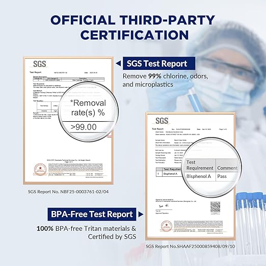 - Superior ACF Filters: The ACF (Activated Carbon Fiber) filters achieve faster flow rates up to 800ml/min and maintaining 99% removal efficiency of chlorine, odors, and microplastics. The 4 stages filtration design enhances particulate capture capacity, ensuring smoother water flow with minimal pressure drop. SGS certificated, Test Report NBF25-0003761-02/04.