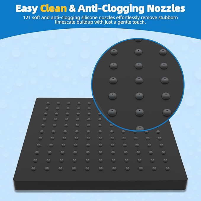 - Self-cleaning Silicone Nozzles: The rainfall shower head has 121 soft silicone nozzles, meticulously designed to prevent limescale buildup and clogging. These high-quality silicone nozzles not only ensure a safe and healthy bathing experience but also make cleaning a breeze. Wipe away any residue or buildup, and the self-cleaning properties of the silicone material will maintain the nozzles in pristine condition, ensuring an enjoyable shower every time