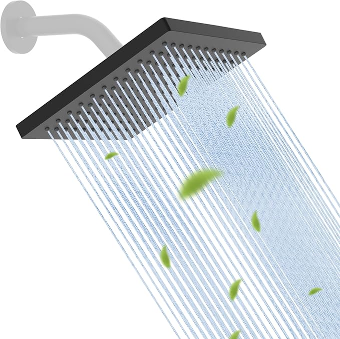 - High-quality Material: The large 8-inch rainfall shower head boasts a substantial, artfully crafted body of premium ABS plastic, complemented by a back panel of certified SUS 304 stainless steel. This material composition ensures the square fixed showerhead is rustproof, lightweight, and built to withstand the test of time, and it also has an excellent elegance and durability that will serve you for years to come