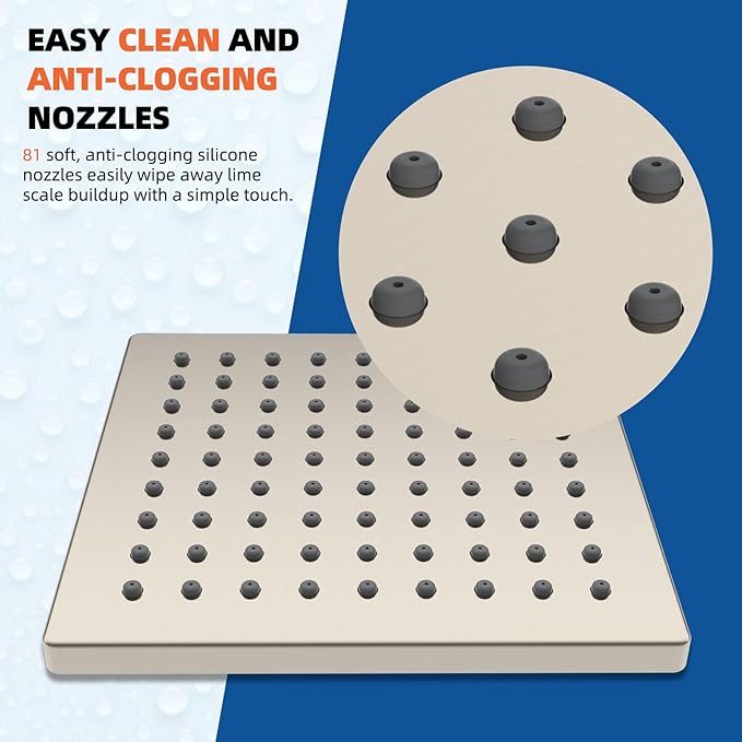 - Self-cleaning Silicone Nozzles: The rainfall shower head has 81 soft silicone nozzles, meticulously designed to prevent limescale buildup and clogging. These high-quality silicone nozzles not only ensure a safe and healthy bathing experience but also make cleaning a breeze. Wipe away any residue or buildup, and the self-cleaning properties of the silicone material will maintain the nozzles in pristine condition, ensuring an enjoyable shower every time