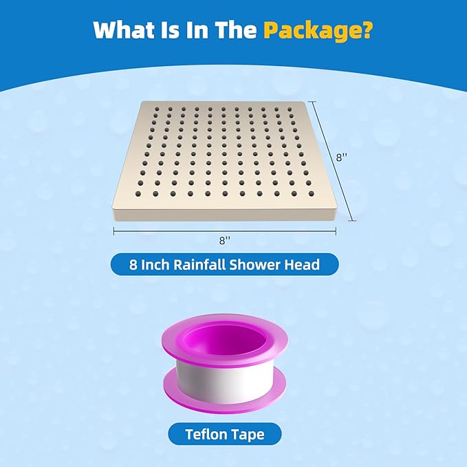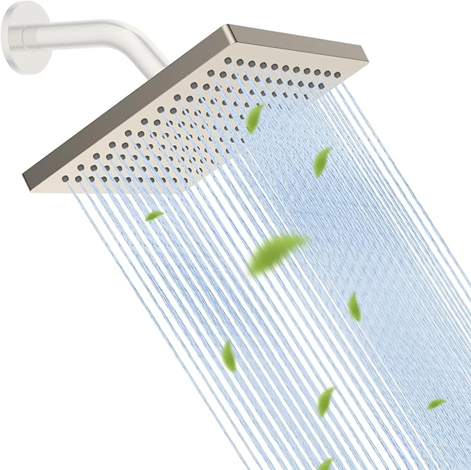 - High-quality Material: The large 8-inch rainfall shower head boasts a substantial, artfully crafted body of premium ABS plastic, complemented by a back panel of certified SUS 304 stainless steel. This material composition ensures the square fixed showerhead is rustproof, lightweight, and built to withstand the test of time, and it also has an excellent elegance and durability that will serve you for years to come