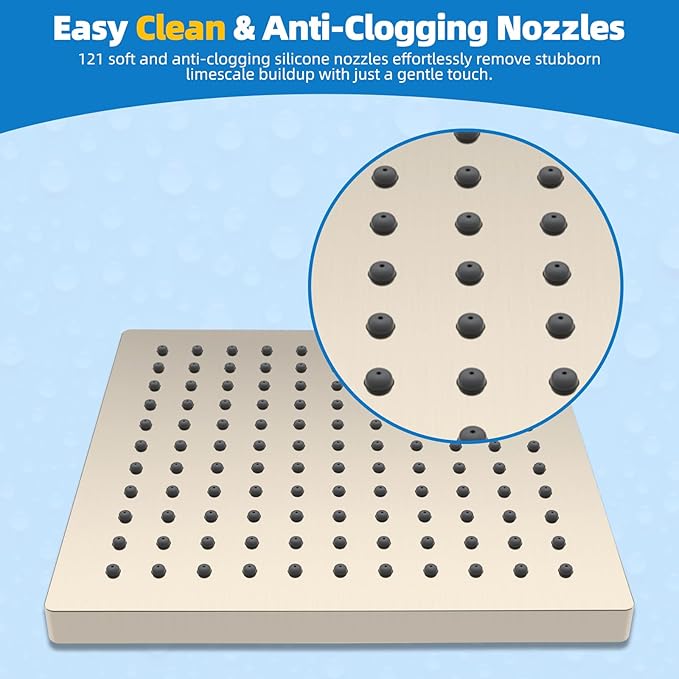 - Self-cleaning Silicone Nozzles: The rainfall shower head has 121 soft silicone nozzles, meticulously designed to prevent limescale buildup and clogging. These high-quality silicone nozzles not only ensure a safe and healthy bathing experience but also make cleaning a breeze. Wipe away any residue or buildup, and the self-cleaning properties of the silicone material will maintain the nozzles in pristine condition, ensuring an enjoyable shower every time