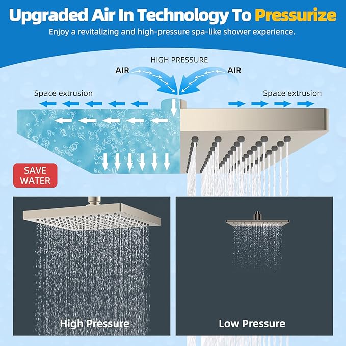- High Pressure Shower Head: The Hibbent 8-inch shower head, with its air-in technology, provides a luxurious rain-like spray that envelops the body in a soothing, enveloping downpour. This dynamic, high-pressure massage experience is delivered even at low water pressure levels, while the brushed nickel finish adds a sleek, modern elegance to your bathroom's decor