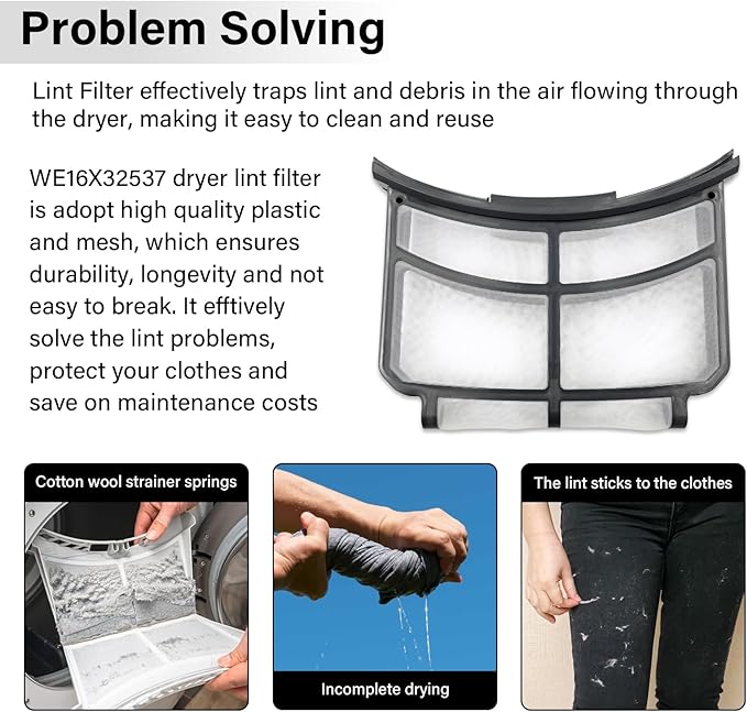 - 【Easy to Install】 The WE16X32537 dryer lint filter trap screen for hassle-free installation without the need for tools. It efficiently captures lint and debris from dryer airflow, and is easy to clean and reuse, ensuring optimal dryer performance.