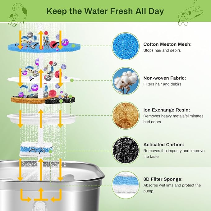 - Multi-Filtration System: this filter is composed of double-density filter, cation exchange resin, coconut shell activated carbon and cotton mesh. Selected high-quality materials, every drop of water is fresh and living water, so that your pets love to drink water