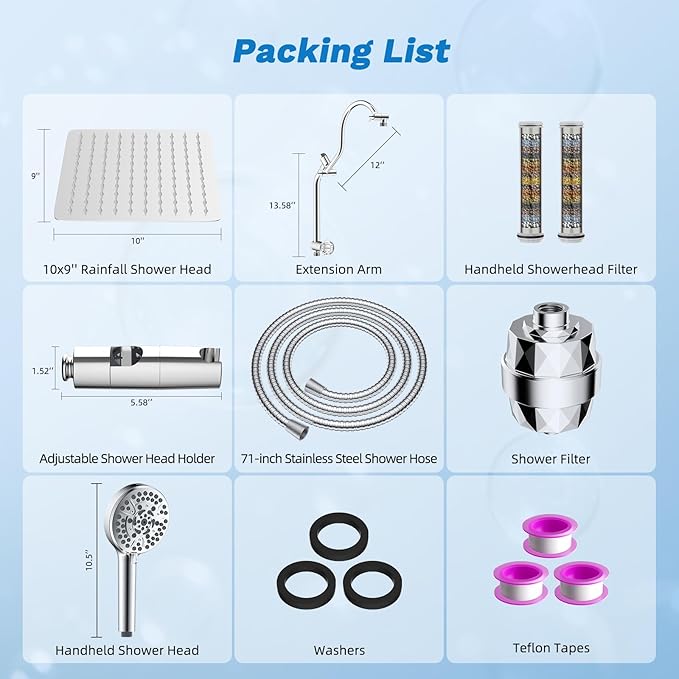 - [10" All-Metal Rainfall Showerhead with 10 Spray Handheld] The all-metal 10*9 inch shower head crafted from high-quality stainless steel for durability and rust resistance. Its ultra-slim design features advanced air-in technology, delivering a refreshing rainfall effect even in low water pressure areas, with 110 splash jets for impressive coverage. The 10 Spray handheld, which allows you to customize your shower experience with modes tailored for everything from invigorating showers to bathing pets. The enhanced Wide Fan Mode provides a powerful, high-pressure flow, making it easy to clean larger areas like tubs and tiles effortlessly