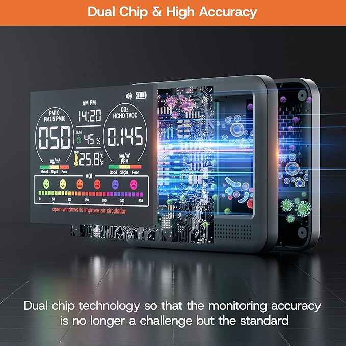 - High Precision and Rapid Data Refresh : Equipped with high-precision sensors, this monitor accurately detects air quality values, sensitively captures data changes, and features a high-performance chip for rapid response and data refresh, allowing you to observe real-time values