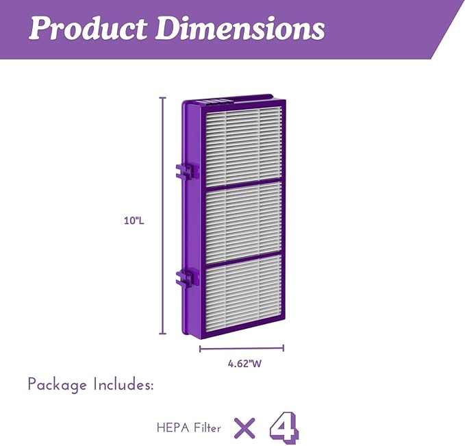 - Filter dimension: 1.2 x 10 x 4.6 inches. 4 HEPA filter included.