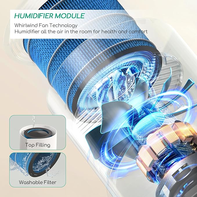 - Mist-Free Humidification Technology: Employing cutting-edge evaporative technology, the humidifier transforms water into nano-sized molecules without creating visible mist, ensuring a clean, dust-free environment. This pure humidification method avoids common issues like water leakage, supporting a healthier lifestyle by alleviating symptoms like coughs, allergies, dry skin, wrinkles, insomnia, and nosebleeds.