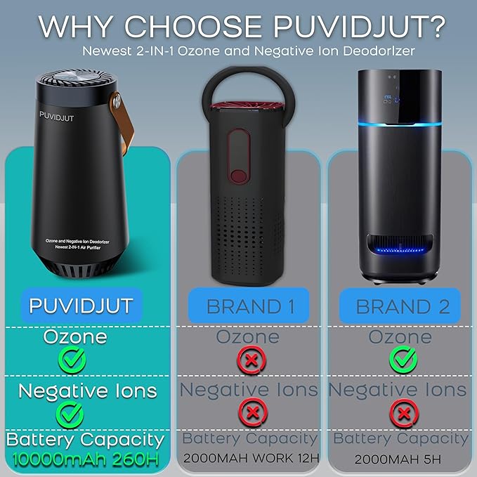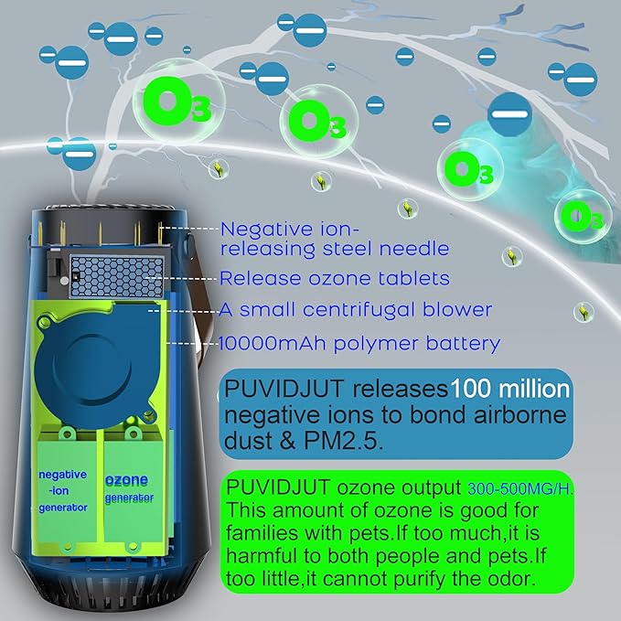 - 2-in-1 Car Air Purifier: PUVIDJUT air purifier for car has ozone and negative ion dual functions. Ozone has a strong oxidative decomposition ability, and negative ions can clean pet dander, and harmful particles in the air. The combination of these two functions can effectively clean dog smell, strong smell of pets' pee and pooph, allowing you to enjoy natural fresh air even keeping your kitty and doggie in your car
