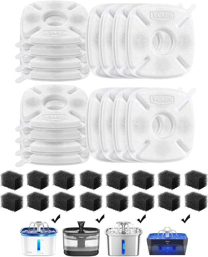 Veken Cat Water Fountain Filter, Classic 16 Pack Replacement Filters & 16 Pack Replacement Pre-Filter Sponges for 50oz, 84oz, 95oz Automatic Pet Fountain Dog Water Dispenser