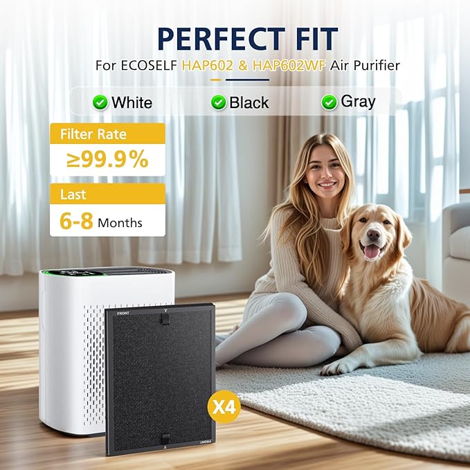 4 Packs HAP602 Replacement Filters for ECOSELF HAP602/ HAP602WF Air Purifi-er, 3-IN-1 HAP602 Hepa Filter Replacement, High-Efficient Filtration with Activated Carbon