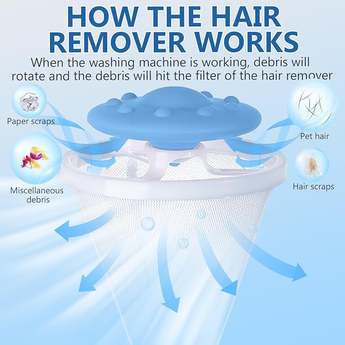 - 【Floating Hair Filtering Mesh Removal】Our Floating Hair Filtering Mesh works by staying on the water's surface throughout the wash cycle. As your machine fills with water, it floats into the perfect position to catch every stray hair that rises to the top, ensuring that no hair is left behind during laundry