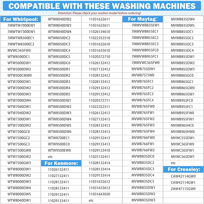 - FIT THESE WASHER MODELS - Compatible with Crosley, Kenmore, Maytag, and Whirlpool top load washer models including Models 110, 7MW, MVW, WET, WTW, etc,. Compatible with 7MMVWB835EW1, 7MMVWB855EC1, 7MMVWB855EC2, 7MMVWB855EC3 7MMVWB955FC0, 7MMVWB955FC1, 7MMVWC565FW0, 7MWTW7000EW1, 7MWTW7300EW1, etc,. Other applicable models please refer to the product description. Thanks!