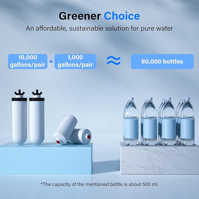 - 【Longer Service Life】Ceramic and Fluoride filters provide up to 10,000 and 1,000 gallons of drinking water, respectively. (Filter lifespan may vary slightly depending on water quality). For optimal performance under normal conditions, replace the PF-4 Ceramic Filter every 10,000 gallons and the FL-2 Fluoride Filter every 1,000 gallons. Note: The TDS level does not fully indicate the quality of the water and our filters DOES NOT lower TDS value.