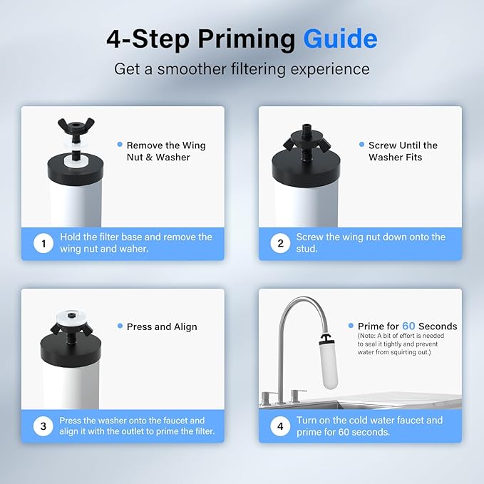 - 【Safe and Washable】The replacement for Berkey or ProOne water filter is certified against NSF/ANSI 372 standard for lead-free materials. Furthermore, The ceramic filters uses BPA-free housing, ensuring its safety. When sedimentation appear on the surface of the filter element, you can use the included sponge to scrub the surface of the filter element to extend the service life of the filter element, but do not use soap or other cleaning materials (otherwise it will clog/damage the filter pores).