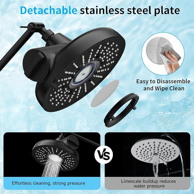 - Power Massage:The laser-drilled stainless steel plate delivers a high-pressure, skin-friendly water flow for a deep massage. It rinses off soap quickly, saving time and water