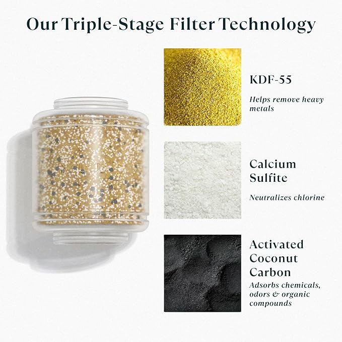 - Advanced Triple-Filtration Technology - NUUD’s showerhead filter features a powerful triple-filtration system using KDF-55, calcium sulfite, and activated carbon - helps to reduce chlorine, heavy metals, and other harmful substances. Experience noticeably cleaner, gentler water that supports your skin, scalp, and hair health. This is the shower head with filters your routine has been missing.