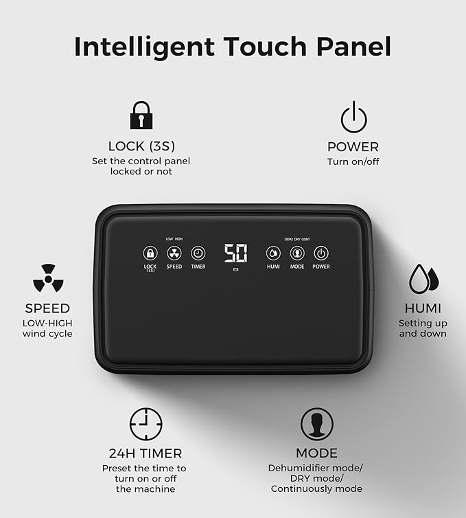 - Intelligent Control for Personalized Comfort - The dehumidifier for bathroom boasts an advanced control system with child lock, variable fan speeds, custom humidity settings, 3 versatile modes (DEHU, DRY, CONT), and a 24-hour timer. The child lock ensures safety, while adjustable fan speeds enhance airflow and drying efficiency. Monitor and fine-tune humidity levels with the real-time display for optimal comfort. The 24-hour timer allows preset operation, maximizing energy savings and convenience
