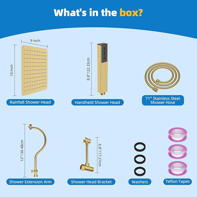 - Metal 10x9'' Rain Shower Head: Made from certified SUS 304 stainless steel, the all-metal shower head combines elegance with durability, ensuring rust resistance and a long-lasting performance. Its slender, modern design, enhanced with air-in technology, features 110 splash jets that deliver a rain spray. The upgraded 10x9'' shower head delivers increased water pressure and is lighter for better support on the extension arm, all while providing the same refreshing, invigorating shower experience