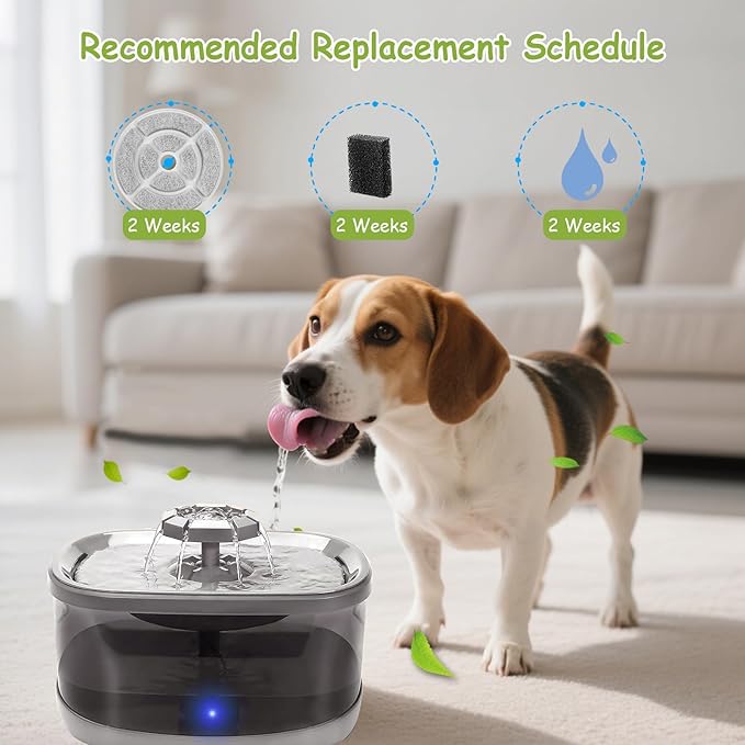 - 🐕【Recommendations For Use】Before use,please soak all pet water filters for 5 minutes and rinse for 30 seconds to awake best performance.It's recommended to replace dog water fountain filters,sponge filter and water every 2 weeks and clean the dog fountain pump.