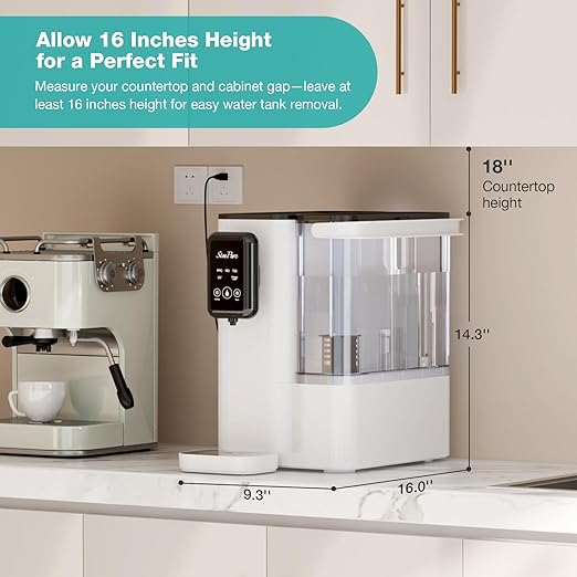 - COMPACT DESIGN WITH EASY INSTALLATION: The SimPure Y9 countertop water filter measures 14 inches in length, 9.3 inches in width, and 14.3 inches in height. Its side-mounted water tank allows easy refilling without lifting the lid. For smooth operation, place it on countertops or under cabinets with at least 16 inches of vertical clearance to avoid hitting overhead cabinets. The Y9 Series RO water filter fits neatly in kitchens, apartments, and offices. It is designed for ZERO installation, offering convenience without requiring complex setup