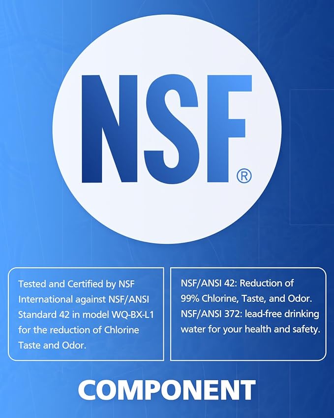 - Advanced Filtration Technology: Effectively reduces 99% of chlorine, taste, odor, heavy metals, and contaminants such as VOCs, THMs, and particles. Provides clean, fresh, and great-tasting drinking water while retaining essential minerals beneficial to health. NSF/ANSI 42 & 372 certified for chlorine reduction and lead-free compliance. Meets European EC-1935/2016, ROHS, REACH, and BPA-Free standards, ensuring premium filtration performance and health safety.