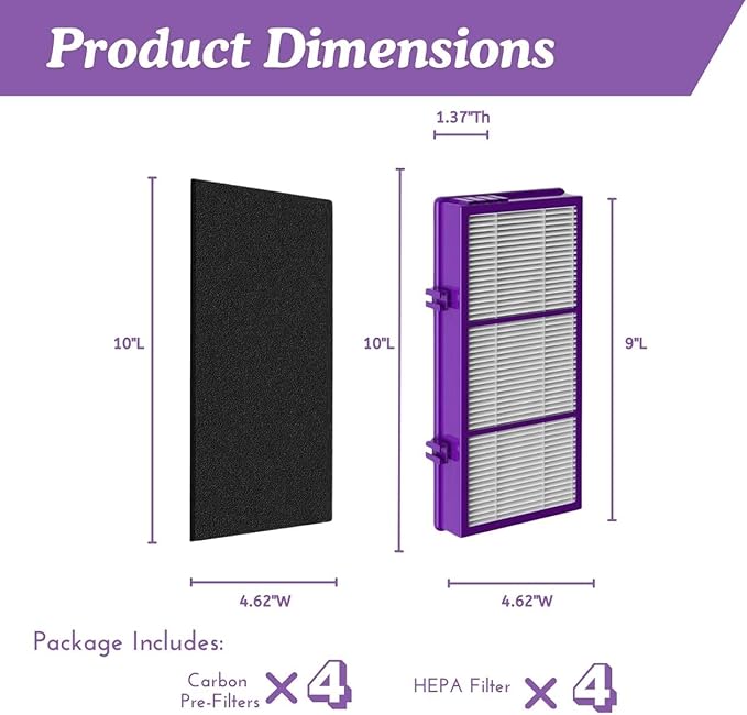 - Includes 4 HEPA filters and 4 activated charcoal pre filters. SIZE: 1.2 x 10 x 4.6 inches. 100% customer satisfaction guaranteed. Quality meets or exceeds leading national brand.