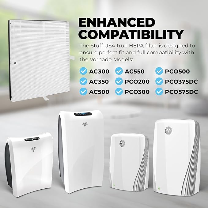 - Enhanced Compatibility: The Stuff true HEPA filter is designed to ensure perfect fit and full compatibility with the Vornado Models AC300, AC350, AC500, AC550, PCO200, PCO300, PCO500, PCO375DC, and PCO575DC