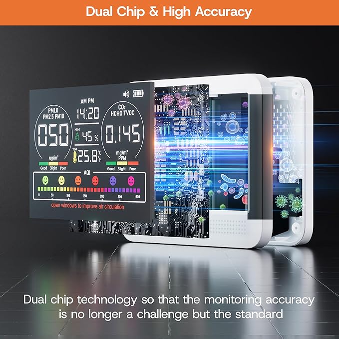 - High Precision and Rapid Data Refresh : Equipped with high-precision sensors, this monitor accurately detects air quality values, sensitively captures data changes, and features a high-performance chip for rapid response and data refresh, allowing you to observe real-time values