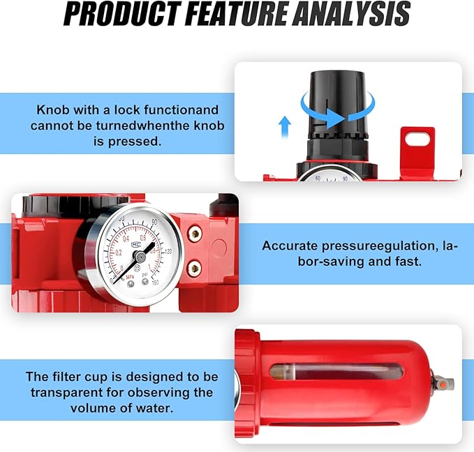 - 【Stage 1-Regulator/Filter】The knob has a locking function that prevents it from being turned when pressed, ensuring accuracy and safety during use. The filter is fitted with a 5 micron cartridge which effectively filters out 95% of particles and water from the air.