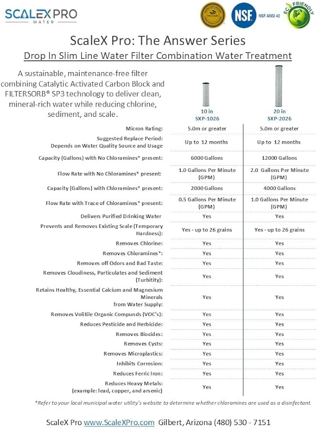 - High-Capacity Filtration: With a robust filtration capacity of 6,000 gallons, our sink filter for hard water is perfect for high-demand environments, ensuring long-lasting, high-quality water for all your needs. Our 10” water filter cartridge is compatible with most 10in Drop In Slim Line Water Systems