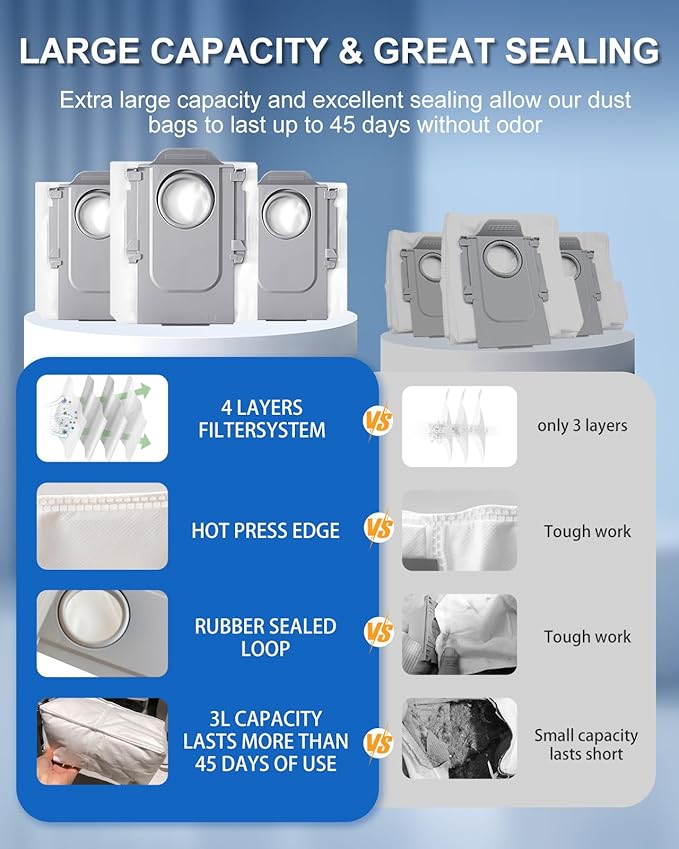 - 【PREMIUM DUST BAGS】Each dust bag in Roborock saros 10R replacement kit has a large 3.0L capacity, which can effectively prevent dust leakage and ensure that the dirt is kept inside the dust bag and never released back into the air with its excellent sealing.The vacuum cleaner bags are advanced with a push-pull handle design, simply remove the full dust bag, without needing to touch dust when changing. Please replace the dust bag every 1-2 months to keep your robot vacuum in optima